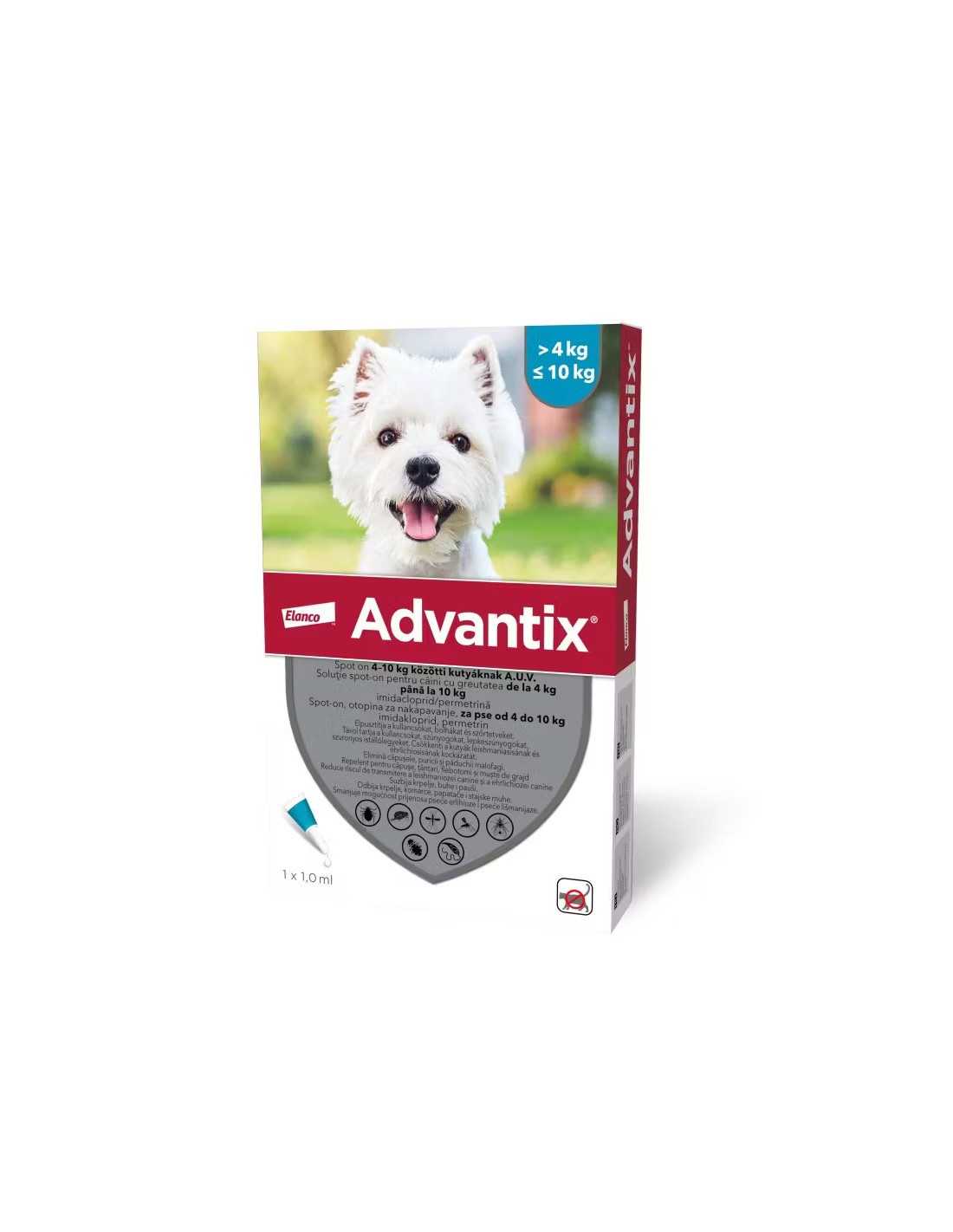Advantix pentru caini 4-10 kg este un produs antiparazitar de uz extern ce contine imidacloprid si permetrina, si este foarte eficient in tratarea infestatiilor cu purici si capuse, pentru o perioada de o luna dupa o singura administrare. Pipeta Advantix poate fi folosita ca tratament impotriva dermatitei alergice provocata de infestatia cu purici. Un tratament asigura actiune repelenta impotriva flebotomilor timp de doua saptamani. Respinge si omoara tantarii si musculitele hematofage, si trateaza si previne infestarile cu paduchi malofagi si anopluri pentru mai mult de 6 saptamani.