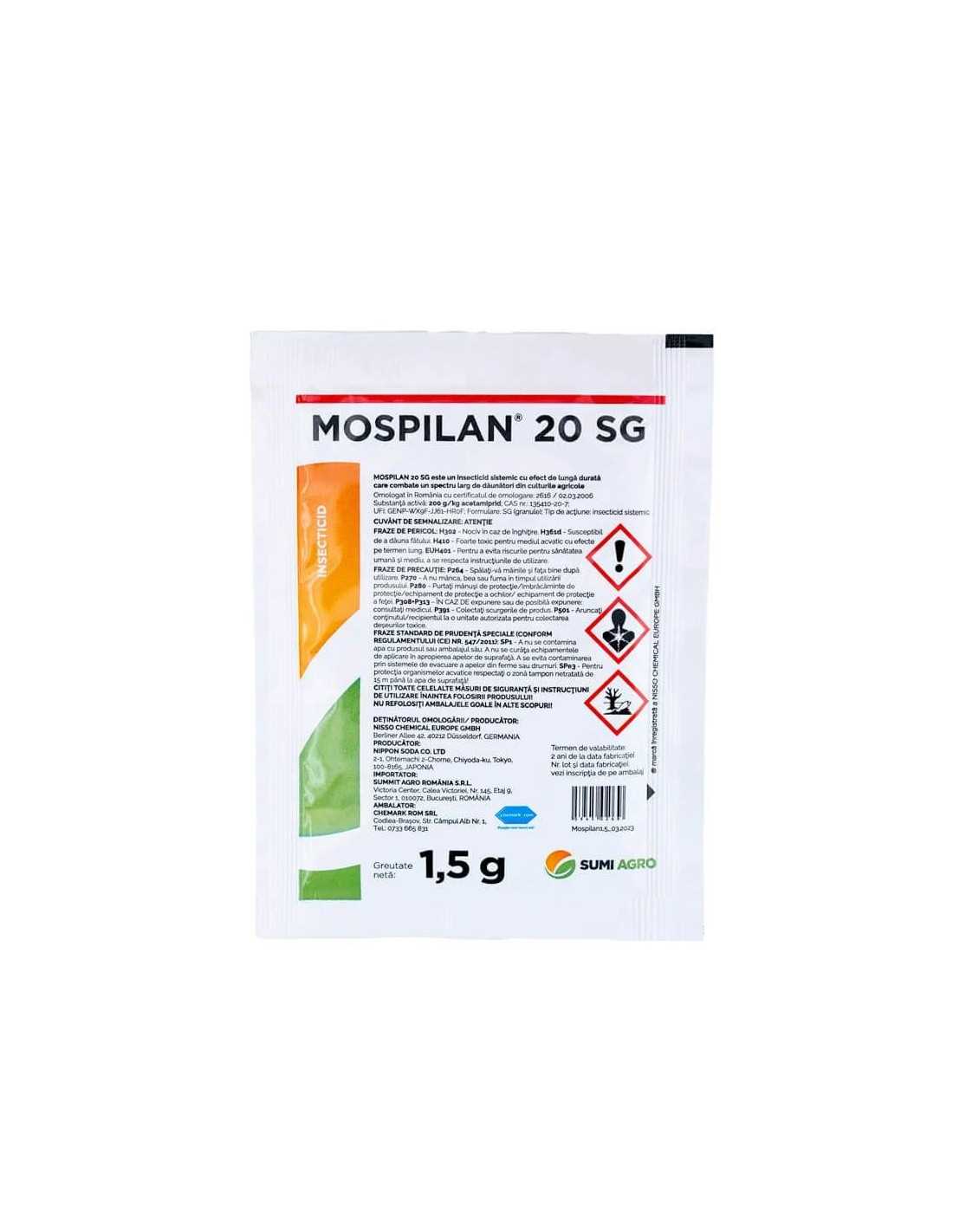 Insecticidul sistemic Mospilan 20 SG 1.5 g contine 20% acetamiprid, sub forma de granule solubile in apa. Produsul este recomandat spre a fi utilizat in combaterea unui spectru larg de daunatori din culturile agricole. Folosind acest produs, la aparitia daunatorilor, dar nu in perioada de inflorit, va asigurati culturi protejate de insecte pe o perioada indelungata (2 - 3 saptamani), datorita noii formulari performante pe care o are acesta. Astfel, culturile vor beneficia de o dezvoltare normala, in care calitatea productiilor nu va fi afectata.