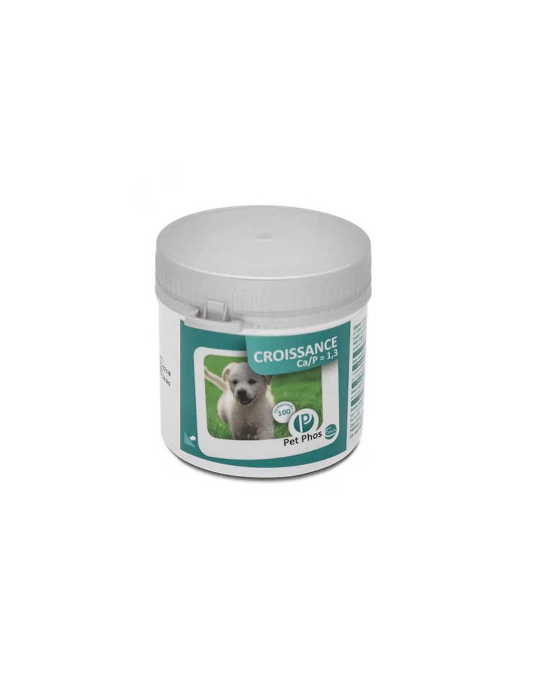 PET PHOS CROISSANCE Ca/P = 1,3 100 Tablete este un supliment vitamino-mineral recomandat cainilor juniori de talie mica si medie, cat si catelelor aflate in perioada de lactatie. Tabletele sunt palatabile si se pot administra ca atare sau in amestec cu hrana. Produsul este recomandat atunci cand animalele de companie sunt hranite cu hrana preparata in casa sau industriala, iar ratia alimentara este dezechilibrata in calciu. Specii tinta: caini.